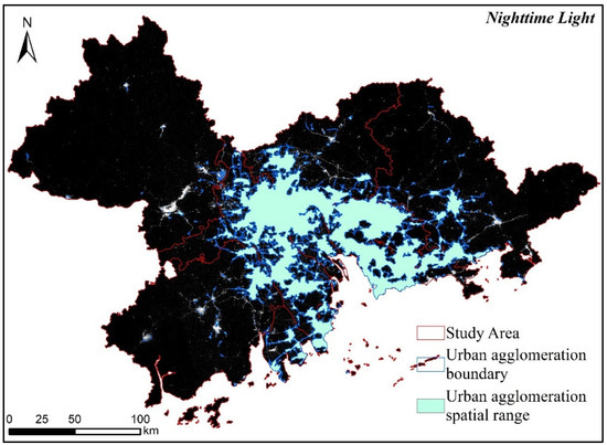 The PRD urban agglomeration encompasses nine cities in Guangdong Province: Guangzhou, Shenzhen, Zhuhai, Foshan, Huizhou, Dongguan, Zhongshan, Jiangmen, and Zhaoqing. The PRD urban agglomeration occupies 30.75% of the land area of Guangdong Province, yet it aggregates 70% of its population and generates 85% of the province’s GDP, making it one of the most dynamic urban agglomerations in China. As of 2020, the urban population of the PRD reached 78.6 million, with an urbanization rate of 87.5%, which is among the highest in China [37]. With ongoing urbanization, the spatial range of the PRD urban agglomeration has undergone significant changes. This region has not only expanded in physical space but also seen an increasing influence in economic, social, and cultural aspects, making the actual range of influence of the PRD urban agglomerations far beyond its traditional administrative boundaries. Therefore, identifying the spatial range of the PRD urban agglomeration aids in better understanding the synergistic development among different cities and elements within the area, providing a scientific basis for urban planning and development. Moreover, the experiences and methods in delineating the spatial range of the PRD urban agglomeration can offer insights and references for the development of other urban areas. Figure 1 presents the study area and the results of NTL data processing.