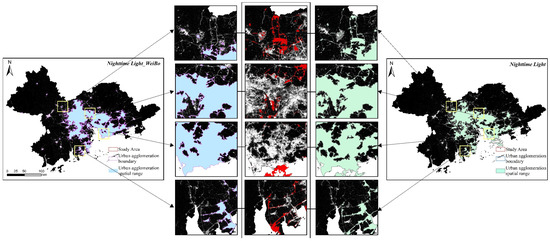 Comparative analysis of urban agglomeration space identification. (The middle column shows the difference in urban spaces identified using NTL_Weibo and NTL, represented by the result of NTL_Weibo minus NTL).