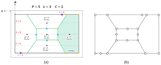 After the calculation of and and having , a network corresponding to the subdivision layout can be built. This network, , is represented by a set of nodes and a set of links denoted by and , respectively. is the union of s in , , and (i.e., ). is the intersection between the nodes in and the union of sides created for the extents in (i.e., ). Figure 1 illustrates a subdivision context and its corresponding network, including the indicated characteristics.