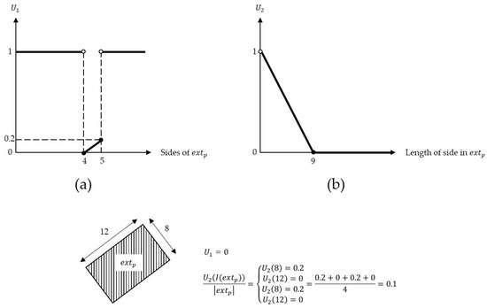 Examples for the penalty functions and . (a) An extent-related shape index: the parcel’s number of sides (). (b) A shape index related to the components of an extent: length of sides of an extent ().