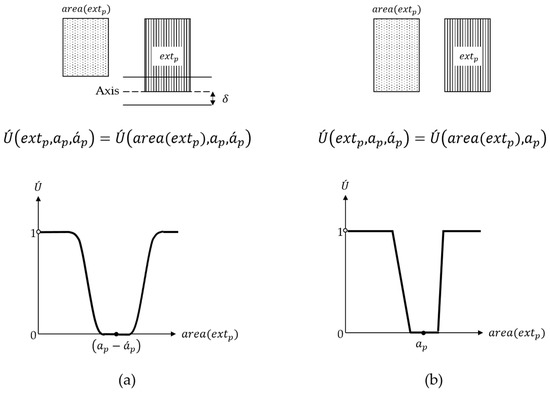 In Equation (1), and are, respectively, the importance values of the shape indices and the area function. and vary between 0 and 1, and . is the number of parcels that should be allocated through the subdivision process. is a set of the shape indices. is the weight of the shape index and is defined by the planner. varies between 0 and 1, and . is a penalty function that maps the value of shape index for to a zero-to-one space. Two types of shape indices can be regarded in the upper level’s objective function: first, the ones directly related to the properties of an extent as a whole (e.g., the number of sides), and second, the indices related to the components of an extent (e.g., the desired length of each side of an extent). Therefore, is a piecewise function that includes sub-function , which decomposes to its constituent parts. If the shape index is of the first type, is not performed on , otherwise, it decomposes , and each component of is penalized by . For instance, if the number of sides () and the length of sides () are the shape indices, and the desired values are 4 with one-side-up tolerance and 10 with 10% tolerance, respectively, and can take the forms illustrated in Figure 2. It should be noted that the penalty functions are not limited to the linear form, and the planner can adopt any type for modeling the penalization behavior. Equation (5) represents in detail.