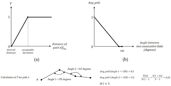 This way, two functions are articulated for the calculation of the length and the angle of a path. Function varies within the range of and penalizes path according to its deviation from a given value. Function decomposes to its constructing links, calculates the angle between the consecutive links, penalizes the obtained angle values, sums the penalties, and divides the sum by , where is the number of links in path . Division to is conducted to set the value between 0 and 1. Figure 4 shows sample functions for and , and the way that can be computed.