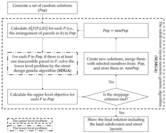 Thus, this article attempts to fulfill the following objectives: (1) conceptualizing a bi-level system of equations that couples the land subdivision and street design processes and can be modified based on the planner’s and planning requirements, and (2) presenting ideas for solving the elaborated equations. Consequently, this research contributes to the literature on spatial planning and computational geography by (1) developing a flexible bi-level optimization model that embeds a street design unit within the land subdivision problem able to represent alternatives regarding the planning concepts, (2) adapting a memetic–genetic algorithm and operators compatible with the structure of the formulated problem, and (3) evaluating the problem and solution method in some representative.