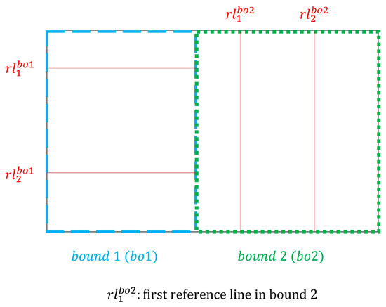 In addition, planners might like to have parcels with different directions within particular areas of . To consider this condition in the solutions, the planner sketches polygons on to set boundaries for special areas including reference lines with different directions. As an example, Figure 6 exhibits a case in which two bounds, each including two reference lines, are sketched.