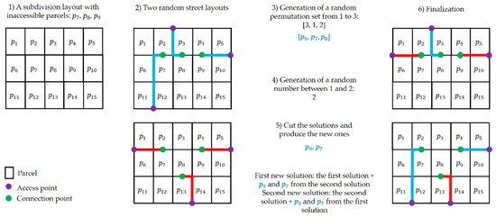 The steps represented in Figure 8 are followed to cross over two selected solutions. Let and be the selected solutions with the inaccessible parcel set of . First, a random permutation is generated equal to the number of inaccessible parcels, . Then, a random integer is generated between 1 and . Second, the random permutation set is cut from , and the streets of the corresponding parcels are combined to form new solutions.