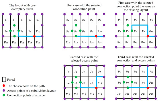 In Equation (2), the street design problem is formulated at the lower level. It outputs the street configuration of a subdivision layout concerning its corresponding network. In other words, the aim of is to select links in corresponding to the subdivision layout with inaccessible parcels (i.e., ), such that each inaccessible parcel is connected to an access point through one of its connection points in . If a path connecting the connection point to is denoted by , and for each inaccessible parcel , is the set that stores paths from s (the connection points on the inaccessible parcel ) to s (the access points in ), and the objective of the lower-level problem is to find the union of optimal paths generated for each inaccessible parcel , minimizing the length and the angle between consecutive links of s.