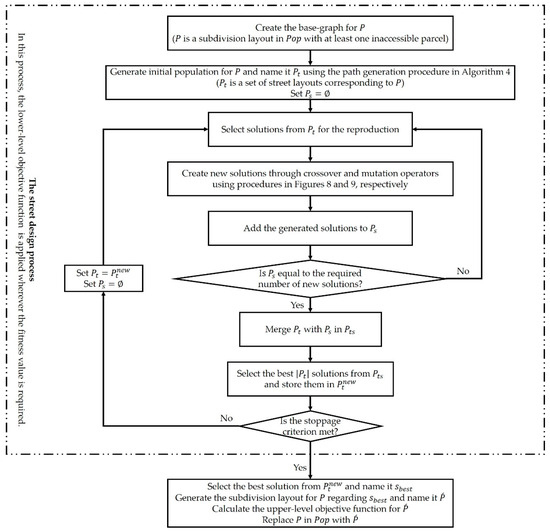 The proposed algorithm consists of three main components: (1) the generation of initial random solutions, (2) the street design genetic algorithm (SDGA), and (3) the subdivision layout memetic–genetic algorithm (SLMGA). First, a population is generated. The population includes several arrangements of parcels in through . Second, the created population enters SLMGA, and the corresponding layout to each member of the population containing the extent of the parcels is computed by . Then, the access condition is checked for each subdivision layout . If has at least one inaccessible parcel, the connection points are created through , and s are calculated. Having access points , the network is made for , and the street layout is designed by the application of SDGA. Third, the upper-level objective is computed for each member of the population. After that, if the stoppage criterion is fulfilled, the best solution is returned; otherwise, new solutions are produced from the answers in the population, and they are stored in a repository along with a certain number of solutions in the population. Note that the size of the repository is fixed during the optimization process, meaning that the number of solutions in the population stays the same after each iteration. Iteration continues until the stoppage criterion is met. Figure 5 depicts the general sequence of calculations for solving the CLSSD. Details of these components are explained in the following sections.