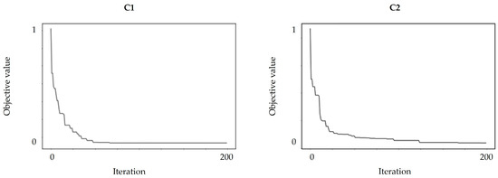 Algorithm convergence process. The values of the objective function are standardized. The minimum values for C1 and C2 are 0.0042 and 0.0082, respectively.