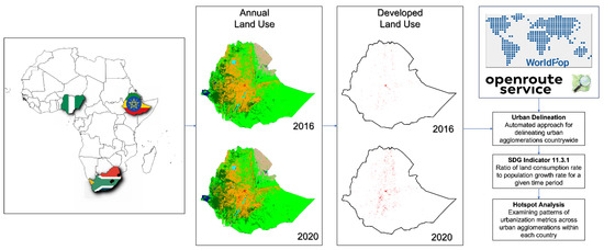 We selected Ethiopia, Nigeria, and South Africa as our case study countries as they represent a diverse range of the political, economic, and societal dynamics in Africa. We use open-source datasets, tools, and spatial techniques in our automated methodology to delineate urban agglomerations, calculate Indicator 11.3.1 and related metrics, and identify hotspots to examine trends of change for the three study countries (Figure 1).