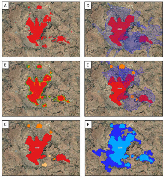 An example of the automated workflow for delineating urban agglomerations for Mekelle, Ethiopia. (A) Developed land raster. (B) Developed land raster pixels reclassified into urban (red), suburban (orange), and urbanized open space (green) pixels. (C) Urban clusters comprising urban, suburban, and urbanized open space pixels are reclassified as core (red), non-core (orange), and clusters not meeting relevant criteria (tan) using population thresholds. (D) Isochrone maps linking core clusters. (E) Isochrone maps linking non-core clusters to core clusters. (F) Final agglomeration boundaries incorporating all relevant clusters for initial year (light blue) and final year (dark blue).