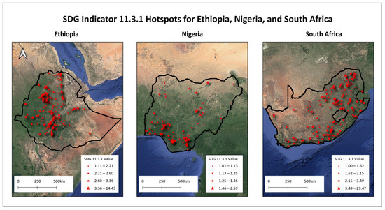 Urban agglomerations in Ethiopia, Nigeria, and South Africa classified as hotspots (presenting Indicator 11.3.1 values greater than one) in the 2016 to 2020 period.