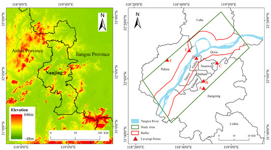 In terms of tectonic units, Nanjing is in the northern margin of the Yangtze ancient land, and the basement is mainly light metamorphic schist and metamorphic volcanic rocks. For the area along the Yangtze River in Nanjing, the overall geological conditions are not very ideal, the main characteristics are loose geology, poor bearing capacity, and shallowly buried groundwater levels. In recent years, Nanjing has experienced rapid urbanization, marked by the extensive construction of underground railways, intensive implementation of ground construction projects, and excessive exploitation of groundwater. Consequently, some areas along the Yangtze River in Nanjing have witnessed land subsidence, posing significant challenges not only to the economic development of the Yangtze River region, but also to the safety and well-being of urban residents. In light of these circumstances, this research focused on the land subsidence along the Yangtze River, especially the 5 km buffer zone on both sides of the Yangtze River in Nanjing as a typical area for land subsidence monitoring and analysis, as shown in Figure 1. A–F were the positions of six leveling points. The findings aim to provide valuable technical insights for urban management and protection.