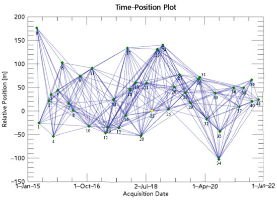 In this experiment, the spatial baseline threshold was set to 48%, and the time baseline threshold was 180 days. The SAR image acquired on 7 September 2018 was selected as the master image. The generated image pairs and baselines are illustrated in Figure 3. Subsequently, the interference processing was assisted by external DEM data. The Goldstein filtering method and the Delaunay MCF unwrapping method were employed [26]. After evaluating the noise area in the unwrapping output and considering the phase information of the research area, the coherence threshold was finally set at 0.2. Following this, orbit refinement and re-phasing were conducted. The residual terrain error and atmospheric delay phase were estimated using two inversions, and finally, geocoding was performed.