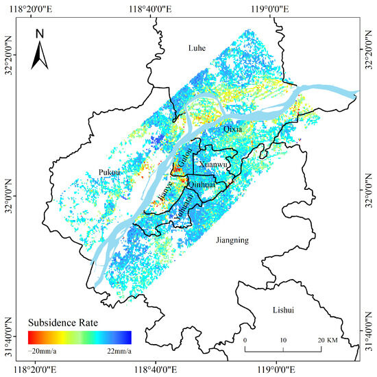- The key areas within 5 km on both sides of the Yangtze River were analyzed. It was found that there were four subsidence funnels from 2015 to 2011, which were distributed in Jianye District and the southwest of Gulou District, the eastern riverside area of Pukou District, the Baguazhou area, and the Longtan Street in the eastern part of Qixia District, respectively. The subsidence in Jianye District was the most severe, and there was a trend of gradually connecting into a large subsidence funnel. The maximum LOS cumulative subsidence of Jianye district was −86.7 mm. The subsidence area along the river in Dingshan Street of Pukou District was the largest subsidence funnel in the study area. The maximum LOS cumulative subsidence reached −78.1 mm.