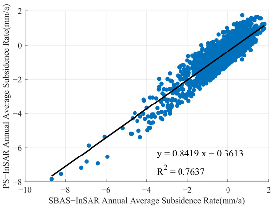 To validate the reliability of the experimental findings in this paper, the results obtained from the two time-series analysis methods were subjected to linear fitting analysis. Linear fitting is a statistical modeling approach used to establish a linear relationship between variables [27]. The least-squares method is usually utilized to determine the most suitable fitting line [28]. The correlation coefficient, which assesses the degree of linear correlation between the two variables, was employed. The coefficient of determination R2, ranging between 0 and 1, was utilized to gauge the goodness of fit of the model. In cases where variables exhibit linear correlation, the coefficient of determination represents the square of the correlation coefficient. The subsidence points sharing identical latitude and longitude were extracted from the outcomes of both PS-InSAR and SBAS-InSAR, facilitating a comparison of the linear relationship between the subsidence of these points observed by the two methods. As illustrated in Figure 6, the annual average land subsidence rates of 2462 subsidence points with the same latitude and longitude underwent linear fitting and analysis. It is evident that the points, with the PS-InSAR monitoring results plotted as vertical coordinates and the SBAS-InSAR monitoring results as horizontal coordinates, exhibit uniform distribution on either side of the fitting line. The coefficient of determination R2 is 0.76, which indicates a high degree of consistency between the two processing outcomes.