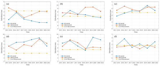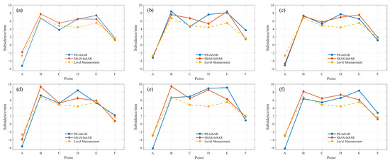 Accuracy comparisons between annual monitoring results from PS-InSAR and SBAS-InSAR and leveling data. (a) 2015.04–2015.12, (b) 2016.01–2016.12, (c) 2017.01–2017.12, (d) 2018.01–2018.12, (e) 2019.01–2019.12, (f) 2020.01–2020.12.