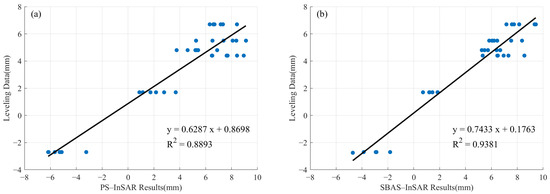 Linear fitting between leveling data and InSAR monitoring results. (a) PS-InSAR fitting results; (b) SBAS-InSAR fitting results.
