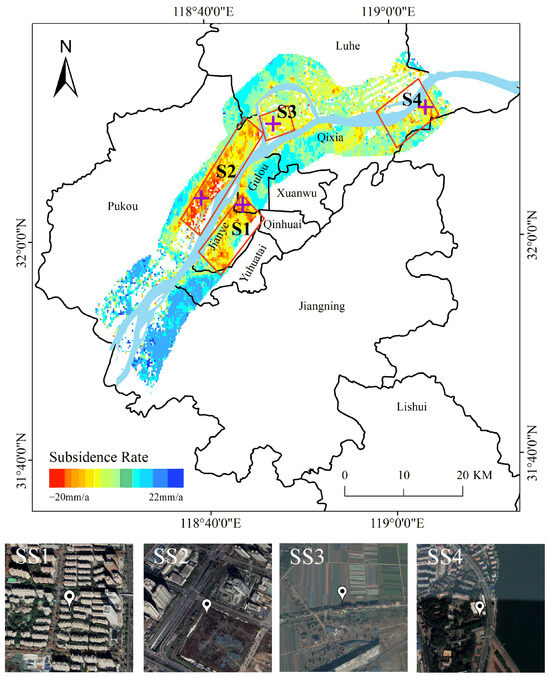 The distribution of the main subsidence areas in Figure 10 reveals a distinct pattern. It can be seen that the subsidence funnel S1 was gradually converging into a larger area. Notably, the southwest area of S1 near the Yuzui Wetland Park in Jianye District exhibited a maximum LOS subsidence rate of −10.4 mm/a, attributed to complex geological conditions. This area comprised an upper soil layer of alternating marshes and shoals of silty clay, and the lower part was the riverbed facies layer composed of medium to fine sand, making it susceptible to subsidence. The northeast area of S1, situated at the junction of the northeast of Jianye District and the southwest of Gulou District (now the Hexi development new area), experienced a maximum LOS deformation rate of −13.6 mm/a. In recent years, the area has been surrounded by high-rise buildings and developed rapidly. Metro Line 2 and Metro Line 10 passed through this area. Therefore, large-scale ground and underground construction was one of the main reasons for the formation of a subsidence funnel in this area. S2 was a super-large subsidence area composed of Jiangpu Street, Dingshan Street, Mount Taishan Street, and Yanjiang Street in Pukou District. This area boasted three metro lines and seven subway stations, with a maximum LOS subsidence rate of −13.5 mm/a. The subsidence rate of this region was directly influenced by its development planning. In June 2015, the Jiangbei New Area of Nanjing was established, formally commencing construction in 2017. The period from 2017 to 2022 witnessed rapid five-year growth in Nanjing Jiangbei New Area. The significant subsidence in this area primarily resulted from high-intensity underground engineering operations and alterations in surface loading. Area S3 was located in the southern part of Baguazhou, Qixia District, exhibiting a maximum LOS subsidence rate of −8.8 mm/a. Baguazhou, a large island in the Yangtze River, is marked by the division of the Yangtze River into its northern and southern branches. Despite the low building density and predominance of farmland, which minimizes the impact of human factors, the area’s geological conditions are not stable due to its formation as a sandbar-type plain in the middle of the Yangtze River through alluvial action. Area S4, situated near Longtan Street along the river in the eastern part of Qixia District, exhibited a maximum LOS subsidence rate of −9.2 mm/a. This area falls within the Ningzhen folded belt and is characterized by soft soil. Given the presence of wharf companies, as well as multiple logistics and warehousing firms in the area, it is prone to subsidence.