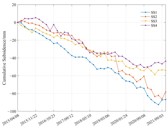 As depicted in Figure 10 and Figure 11, the feature point SS1 was located close to Jiangdong Street, Mochou Lake Street, and Binhu Street, with Metro Line 2 passing through. The LOS cumulative subsidence at SS1 amounted to −86.7 mm. This subsidence can be attributed to the excessive building density and load in this area, as analyzed earlier. The SS2 point, situated near Jiangpu Street in Pukou District, exhibited an overall gradual subsidence trend, with an LOS cumulative total subsidence of −78.1 mm. However, there were two rapid subsidence trends in 2019 and 2021, which can be closely linked to the development plan of the area. Point SS3 was situated in the Baguazhou area. While there was a slight rebound observed on the ground over a relatively short period, the overall trend of subsidence remained slow and stable. The LOS cumulative total subsidence at SS3 amounted to −53.8 mm. This trend can be attributed to the unstable geological conditions prevalent in the area. The LOS cumulative settlement at point SS4, situated in Longtan Street, Qixia District, has reached −43.5 mm, indicating a generally stable sinking trend, but with a noted rebound since September 2020.
