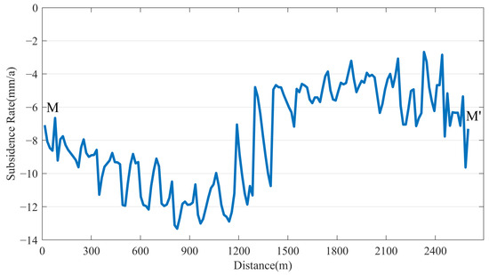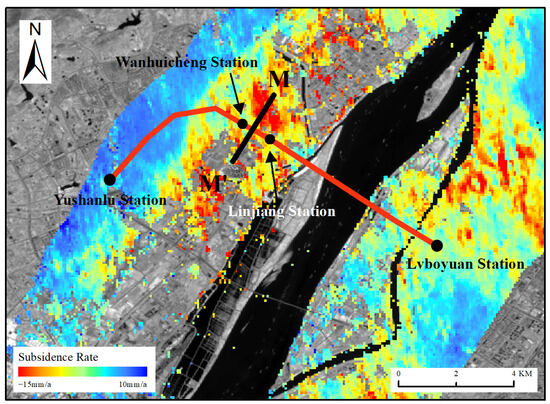 To analyze the characteristics of the transverse ground deformation changes near Wanhuicheng and Lingjiang Stations, a transverse profile line MM’ across the subway line was selected in an area with serious subsidence. Subsidence rates of the points on the profile line were extracted for further analysis. Figure 13 shows the spatial distribution of subsidence rates on the transverse section line. The results indicated that the subsidence rates of the points on the MM’ profile line were unevenly distributed on both sides of the subway, with many small fluctuations. The LOS subsidence rates on the M side were significantly faster than that on the M’ side, and the LOS subsidence rates were in the range from −13.32 mm/a to −2.67 mm/a, which showed a general sinking trend. The different degrees of land subsidence around these subway stations indicate that there may be a certain relationship between subway station operation and ground subsidence. To prevent the occurrence of various situations, such as structural damage and safety hazards, regular monitoring and maintenance are necessary.