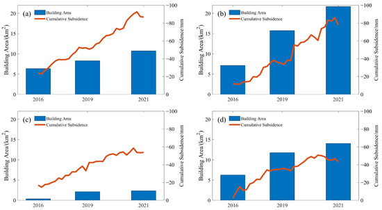 The acceleration of urbanization has increased a load of construction projects on the urban ground, which, in turn, poses a risk of land subsidence [30,31]. To investigate the impact of urban construction on land subsidence along the Yangtze River in Nanjing, the Landsat8 OLI images from 2016, 2019, and 2021 were used in this experiment to extract the ground buildings in the subsidence funnel areas. Based on the normalized building index (NDBI) obtained from Landsat 8, the ground buildings were extracted, and the areas were calculated [32]. The results found that the areas of ground building in the subsidence funnels along the Yangtze River have steadily increased from 2015 to 2021, as shown in Figure 14. By comparing the time-series deformation trend of the key feature points (Figure 11) extracted by SBAS-InSAR technology with the ground building areas, the impact of the building area changing on land subsidence was analyzed. Figure 14 shows that as the ground building areas continued to increase during 2016–2021, the cumulative subsidence of the feature points in the areas also increased. It can be inferred that the increase of ground building area brought by urban expansion is positively correlated with land subsidence to some extent.