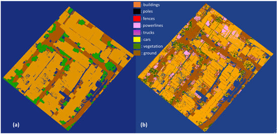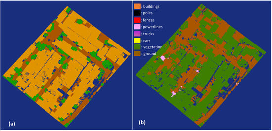 Primary testing data (Cimahi City, Indonesia): (a) manual labeling; (b) semantic segmentation results of the PointNet++ model.