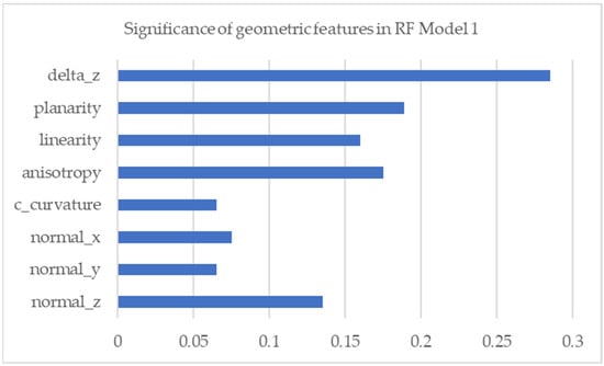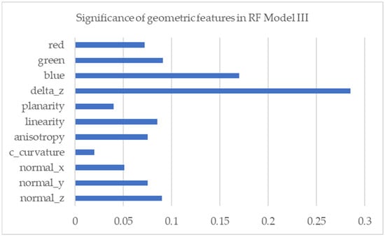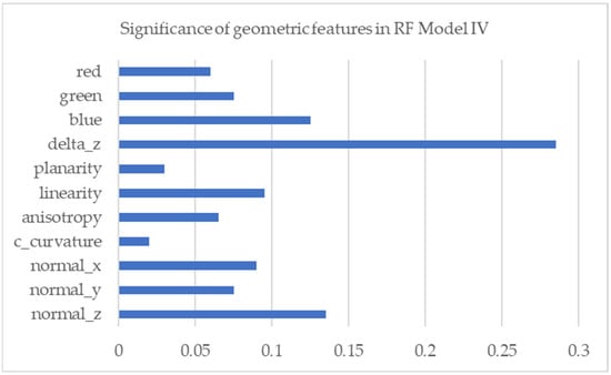 In Table 5, the OA value of RF model IV decreases by 1% when compared to RF model III, but the precision and recall values increase significantly. The geometric feature of a vector normal to the Z axis increases compared to RF model III. Furthermore, the ‘Blue’ geometric feature is not as large as in RF model III. A diagrammatic visualization of the significance of geometric features on RF model IV is shown in Figure 9.