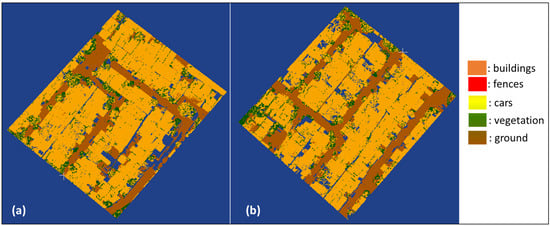 Even though this research provides a new insight into RF algorithms’ performance in semantic segmentation with small training datasets, especially in building-class objects, it also has many shortcomings. The segmented result from RF still consists of scattered noise in a class (Figure 3, Figure 5, Figure 6 and Figure 8), resulting from algorithm weakness [], unlike the PointNet++ algorithm, which uses an autoencoder (AE) solution in DL []. The components of AE are encoder, decoder, and bottleneck. The adopted AE in PointNet++ consists of 3D convolutional layers, which influence the segmentation success in order to code 3D blocks. However, this is beyond the scope of this research. The convolutional 3D blocks in this research only use the default, which is 50 × 50 m in horizontal size and maximum vertical size inside the horizontal size. In PointNet++, the 3D convolutional layers are called abstraction techniques so that the structural transformation can be studied locally and globally [,]. Since the development of convolutional layers in the abstraction techniques in PointNet++ was not studied and developed in this research, the learning process of the PointNet++ algorithm was optimal for learning important features. Consequently, it was not optimally applied to training data and test data with different characteristics. Also, this research does not use the number of trees recommended by Zeybek (2021) related to the amount of dataset in developing the RF model. Furthermore, there are still a lot of DL algorithms that can be used and explored other than PointNet++.