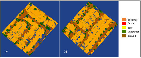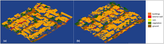 The purpose of the second experiment was to analyze the performance of the RF algorithms. RF model II was trained with primary training data using the same geometric feature extraction as the previous experiment. The best-selected parameter number of trees was 100 and the splitting data function was ‘Gini’. Segmentation of the testing data and validation data yielded OA < 86%, precision < 48%, recall < 48%, and F1 score < 48%. The precision, recall, and F1 scores are smaller than the OA value because there are imbalance classes where car object classes are not segmented into car classes, but instead into building classes. Apart from that, the fence object class is present in the training data, but not in the testing and validation data. The segmentation results for the building class show relatively high precision, recall, and F1 scores of <90%. Appropriately, this accuracy value was increased compared to RF model I, trained by secondary data. Table 2 shows the OA, precision, recall, and F1 score values. A visualization of the semantic segmentation results of the RF 2 model is depicted in Figure 5.
