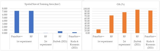 In the first experiment, RF model I performed better than PointNet++ (Figure 2 and Figure 3), as the spatial size of the training was similar for both models. In the second experiment (RF model II), the spatial size used for the training in the RF model was smaller than in the previous experiment (RF model I). The OA score improved by ±13% as the training spatial size was reduced significantly. When compared to the other experiment, the spatial size of the training area was the smallest, but the OA score was not ranked the lowest (Figure 10). Even though RF model II was greatly improved, the OA score was not as satisfying as in Zeybek (2021). This shows that the RF algorithm is not substantially affected by the spatial area size of the training data.