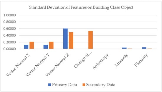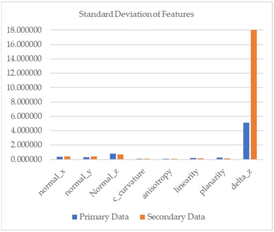 Moreover, there is a massive discrepancy between the OA score that resulted from PointNet++ model from the first experiment and the OA score obtained by Kada and Kuramin (2021), even though the regions in the training and testing area are similar []. The differences in characteristic features between training data (secondary data) and testing data (primary data) were probably due the implementations in different regions. The standard deviation of the features from datasets implies variance. The highest variance of all the feature in the primary and secondary datasets was height from AGL. RF model I was most significantly influenced by height from AGL (Figure 4). The variation of features can be seen in variance values (Figure 11). Even though the variance of height from AGL in the secondary data was higher than in the primary dataset, RF model I, trained on the secondary dataset, had a higher performance than the PoinNet++ model. This indicates that the PointNet++ algorithm failed to capture the height from AGL feature, even though height is the most significant feature in the RF model. PointNet++ aggregates local features to the largest activation, hindering regional information from being fully utilized []. Also, the height from AGL is difficult to identify in the PointNet++ model because the height system refers to the geoid.