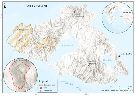 Lesvos Island is characterized by numerous geological sites, areas of natural beauty, a rich biotic and abiotic heritage, and numerous cultural monuments [41]. Therefore, it is recognized as a UNESCO Global Geopark. Geological structures like volcanoes, fossil sites, active faults, waterfalls, and hot springs may be found all around Lesvos Island [42]. The Petrified Forest of Lesvos, which is located on the western peninsula of the island, is the most well-known geoheritage site on the island.