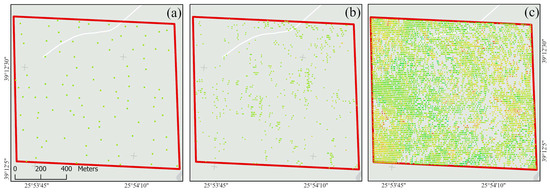 PSI Med and Full resolution datasets consist of 45,749 and 283,419 PSs, respectively, geolocated in the broader area of Lesvos Island, for the period between 2015–2020. The PS/DS dataset consists of 11,169 points for the period between 2019–2021 located in the broader area of Bali Alonia Park. When referring to dataset point density, for an area of 40 ha, the number of targets varies significantly between each dataset’s resolution, as presented in Figure 3.