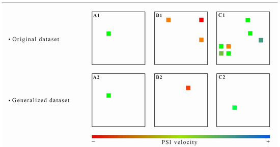 Random cells affected by the designed generalization procedure. Example A presents a cell containing a single PS target (A1), so no generalization is considered (A2). Examples B and C indicate cells with 3 (B1) and 7 (C1) PSs from the original dataset. The corresponding spatial mean of each cell containing points of the original dataset is a newly created point for the generalized dataset ((B2,C2) respectively). The velocity rate of generalized dataset points (B2,C2) is the mean value of all containing point velocities for the corresponding cell of the original dataset (B1,C1), respectively.