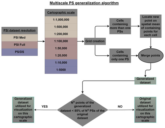 Flowchart of a generalization algorithm for PSI datasets of different resolutions are presented at various cartographic scales. The relationship between the PSI dataset resolution and the cartographic scales is presented using colors, as is the case for Figure 6 as well.