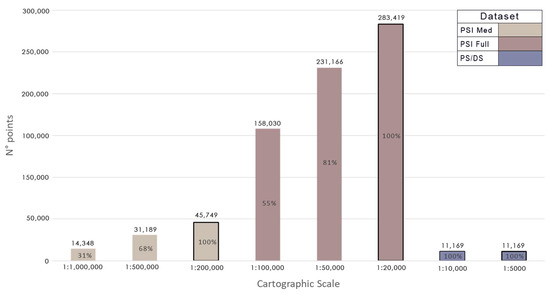 Dataset used for generalization of the smaller cartographic scale (1:1,000,000), consisting of 14,348 points (31% of the original dataset’s point count, PSI Med). For the 1:500,000 scale, the generalized dataset used consists of 31,189 points (68% of the total number of points in the original dataset, PSI Med). For the 1:200,000 scale, the original dataset (45,749 points) is used. For the 1:100,000 scale, a generalized dataset consisting of 158,030 points (55% of the original dataset, PSI Full), is used. For the 1:50,000 scale, a generalized dataset of 231,166 points (81% of the total number of points in the original dataset, PSI Full), is used. For the 1:200,000 scale, the original PSI Full resolution of 283,419 points is used for visualization. For both the 1:10,000 and 1:5000 scales, the original PS/DS dataset is used for visualization. The columns with black boundaries indicate cartographic scales with no generalization requirements, which are considered to be the most suitable cartographic scales for each one of the original datasets.
