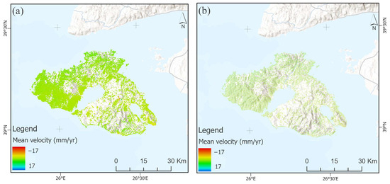 By visualizing PSI datasets at appropriate cartographic scales via the web map ap-plication, it is clearly shown that Lesvos Island is not characterized by significant ground deformation. Negative velocity rates between −5 mm/yr and −8 mm/yr, indicating land subsidence, are derived in the east part of the island, close to Lampou Mili village. Positive velocity rates (i.e., uplift) reaching 2 mm/yr, are noted on the northern part of the island, between the Mythimna–Efthalou region.