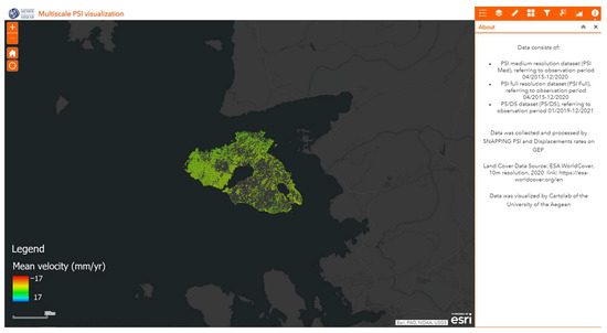 This web cartographic application is accessible using the following link: https://sdi-portal.aegean.gr/PSIMultiscaleVisualizationWebApplication or PSI Multiscale Visualization Web Application PSI Multiscale Visualization Web Application (accessed on 13 February 2024 https://sdi-portal.aegean.gr/portal/apps/webappviewer/index.html?id=da2ee539746647b9890290b325052e39).