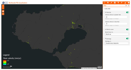An interactive cartographic web application was developed, in which users have the option to properly visualize, explore, analyze, and export PSI data in each of the eight available cartographic scales. This application provides the layer list and legends of each dataset, according to each cartographic scale. Apart from changing the base map using a dropdown menu of available layers, other tools are also available to measure distances and areas. A preview of the web application is presented in Figure 8.