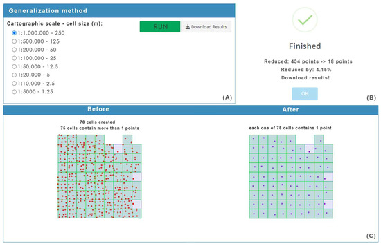 A preview of the web application for PS target generalization. (A) A generic PSI dataset, consisting of 434 point targets, is generalized at a scale of 1:1,000,000. (B) Pop-up message after generalization procedure. For a generalized dataset consisting of 18 points, the number of points is reduced by 4.15% compared to the number in the original dataset. (C) Preview of both (original and generalized) datasets. The transparent cells contain the original PSs. A download option is available for the generalized dataset.