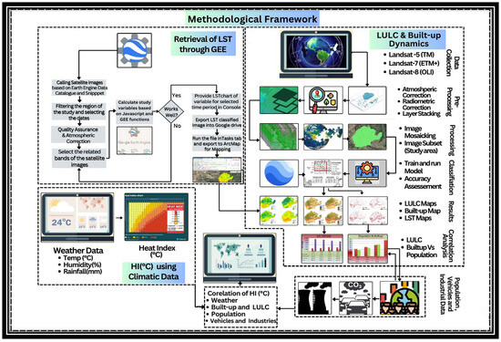 In the existing literature, numerous studies have examined the relationship between LULC and LST using remote sensing, highlighting their significance in global climate research and land management [1,6,25,26,27,64,65,66,67]. LST variations influenced by LULC changes provide critical insights into heat distribution patterns and human-induced environmental impacts. However, the existing research predominantly focuses on direct LULC–LST relationships without fully integrating additional socio-economic and climatic factors. This study takes a broader perspective, considering the combined impact of population growth, LULC changes, urban expansion, and increased vehicular and industrial activity on air quality and climate indicators such as the LST and heat index (HI). This research aims to bridge these gaps by providing a comprehensive understanding of how these factors collectively influence air quality and contribute to climate change, particularly in terms of LST and HI variations. This multifaceted approach aims to clarify the complex interactions between human activities, environmental conditions, and thermal dynamics, contributing to a comprehensive understanding of urban heat islands and informing effective urban planning and climate adaptation strategies. By examining the interplay between urbanization processes, air quality, and climate dynamics, this study seeks to inform evidence-based policy interventions and adaptive strategies aimed at mitigating the adverse impacts of urbanization on environmental sustainability and public health.