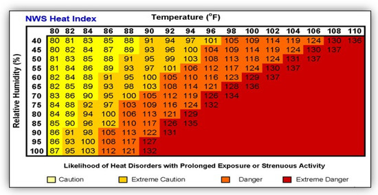 National Weather Service heat index chart (source: https://www.weather.gov/ last accessed on 3 November 2023).