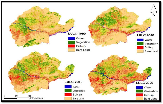 This study involved the acquisition of land use and land cover (LULC) maps for the Peshawar Valley on selected days in 1990, 2000, 2010, and 2020, as shown in Figure 4, following thorough preprocessing and supervised classification. To assess the accuracy of this LULC classification, ground-truth data from Google Earth were employed, and the corresponding results are documented in Table 4. Impressively, Table 4 highlights that the classification of all LULC classes exhibited an exceptional accuracy level of nearly 90%. The classified images showcased in Figure 4 effectively capture the spatiotemporal dynamics of the LULC changes over the specified years. Furthermore, Table 5 neatly summarizes the LULC distribution for each type across the different years. A notable trend emerged in the city of Peshawar, where there was a discernible increase in built-up areas alongside a reduction in barren land from 1990 to 2020. This transformation underscores the evolving landscape of the city of Peshawar over the years, emphasizing the importance of monitoring and managing land use in urban areas.