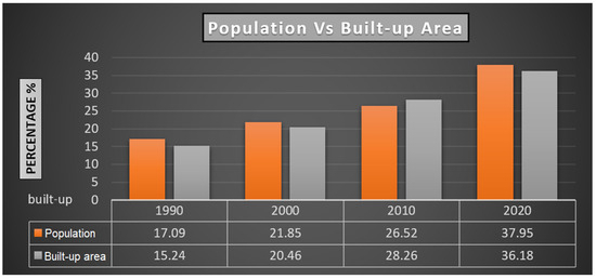 Pakistan has the highest rate of urbanization in South Asia [1]. In Pakistan, urbanization has mainly affected the growth of the population in major cities due to a lack of planning and policy. An expansion in urban population necessitates the construction of living facilities [34], such as new residential and business and economic zones, public utilities, and transportation networks, which ultimately leaves footprints on the environment [6,35,36]. The LULC has undergone significant transformation over the past few years [37]; barren land and farmland has been lost as a result of urban growth, which has also affected socioeconomic change [38,39]. Farmland has gradually become urban areas, while forest land has been transformed to cropland [40,41]. These changes have exerted a notable influence on the surrounding ecological landscape and frequently endanger sustainable urban growth [6,42,43].