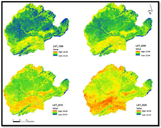 - 3.2. Land Surface Temperature (LST) Variations: This section examines the variations in land surface temperature using Landsat imagery from 1990 to 2020.