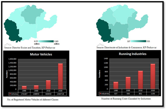 Population data were obtained from the Pakistan Bureau of statistics, Government of Pakistan official site for the 2017 and 2023 censuses [73], while some population data were collected from Government of Khyber Pakhtunkhwa site from the population censuses of 1981 and 1998 [74]. Data for the number of registered vehicles, including both government and private vehicles, were collected from the Excise and Taxation Department Khyber Pakhtunkhwa from 1990–2020, while data for the number of running units classified by industry (manufacturing, construction, mining and quarrying, and electricity generation and distribution, including gas distribution (EGD and GD)) from the year 1990 until 2020 were collected from the Directorate of Industries and Commerce, Khyber Pakhtunkhwa, Peshawar, as shown in Table 2.