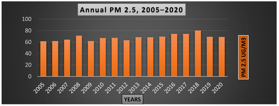 In recent years, quick urbanization has given rise to numerous environmental challenges, such as water and air pollution, and increased concentrations of greenhouse gases, which impact the local and regional climate through both biogeochemical and biochemical mechanisms [44]. Pakistan has witnessed rapid industrial expansion, contributing to a positive enhancement in the community’s living standards, as evident from the increasing vehicular traffic on roads [45]. Assessing air and water resources in terms of quality in Pakistan is important, and the existing acknowledgment of this issue is considered urgent [46,47]. According to the World Air Quality Report (2019), Pakistan is ranked second globally, following India, as the country with the highest levels of pollution worldwide in terms of hazardous airborne PM 2.5 particles [45,48].