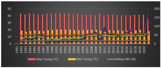 Climate data, encompassing temperature metrics such as minimum, maximum, and mean values, in addition to relative humidity and rainfall (precipitation), were systematically gathered. The sources for this comprehensive dataset included the Regional Meteorological Center (RMC) in Peshawar, along with the National Aeronautics and Space Administration (NASA) [72]. This dataset covers the period from 1991 to 2020 and provided detailed information for each month throughout this duration.