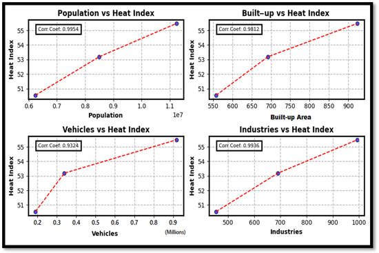 - 3.4. Weather Data and Heat Index: This section investigates the variations in weather data and their effect on the heat index from 1990 to 2020. It further explores the impact of air quality and emission factors on the heat index dynamics and analyzes the correlation between the heat index and population, built-up areas, vehicles, industrial activity, and climatic data.