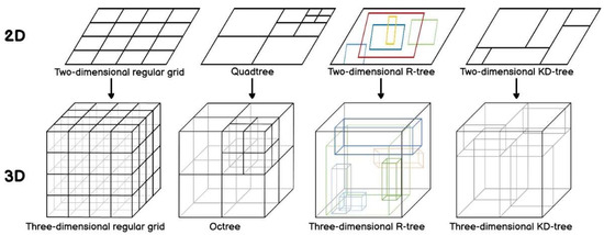 Overall, this study aims to increase the flexibility and maneuverability of point clouds for subsequent processing by building reliable and efficient spatial indexes [19]. As depicted in Figure 1, the point cloud indexing structures that have received the most attention are mainly based on regular lattice grids, Quadtree, Octree, R-tree and its variants, and KD-tree [8].